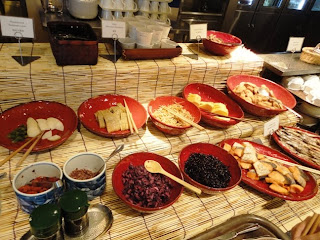 We had breakfast at the hotel this morning -- a pretty buffet breakfast like dinner, so of course we tried everything :3 They had pretty pastries and pretty fruit, and also some stir-fried food (which was kind of weird) and Japanese-style breakfast food, too~ I got a pineapple danish, a muffin, a waffle, a hash brown, and a piece of tofu, along with rice and rice seasoning on top ^ ^ I also tried Darjeeling tea with cream and sugar, and another tea (forgot which) with cream and sugar. Tiffy got a waffle, a pancake, a piece of salmon, a hash brown, and a chocolate danish with milk. And I also made her try natto, a fermented soy bean dish exclusive to Japan. It smells... very... ripe.